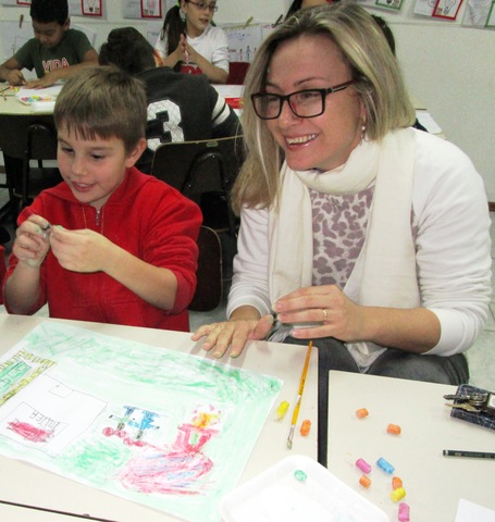 Eu mesma fiz o presente, um marcador de páginas e uma bonequinha de elásticos. Dei um abraço e um beijo em minha mãe, eu a amo com suas qualidades e defeitos.